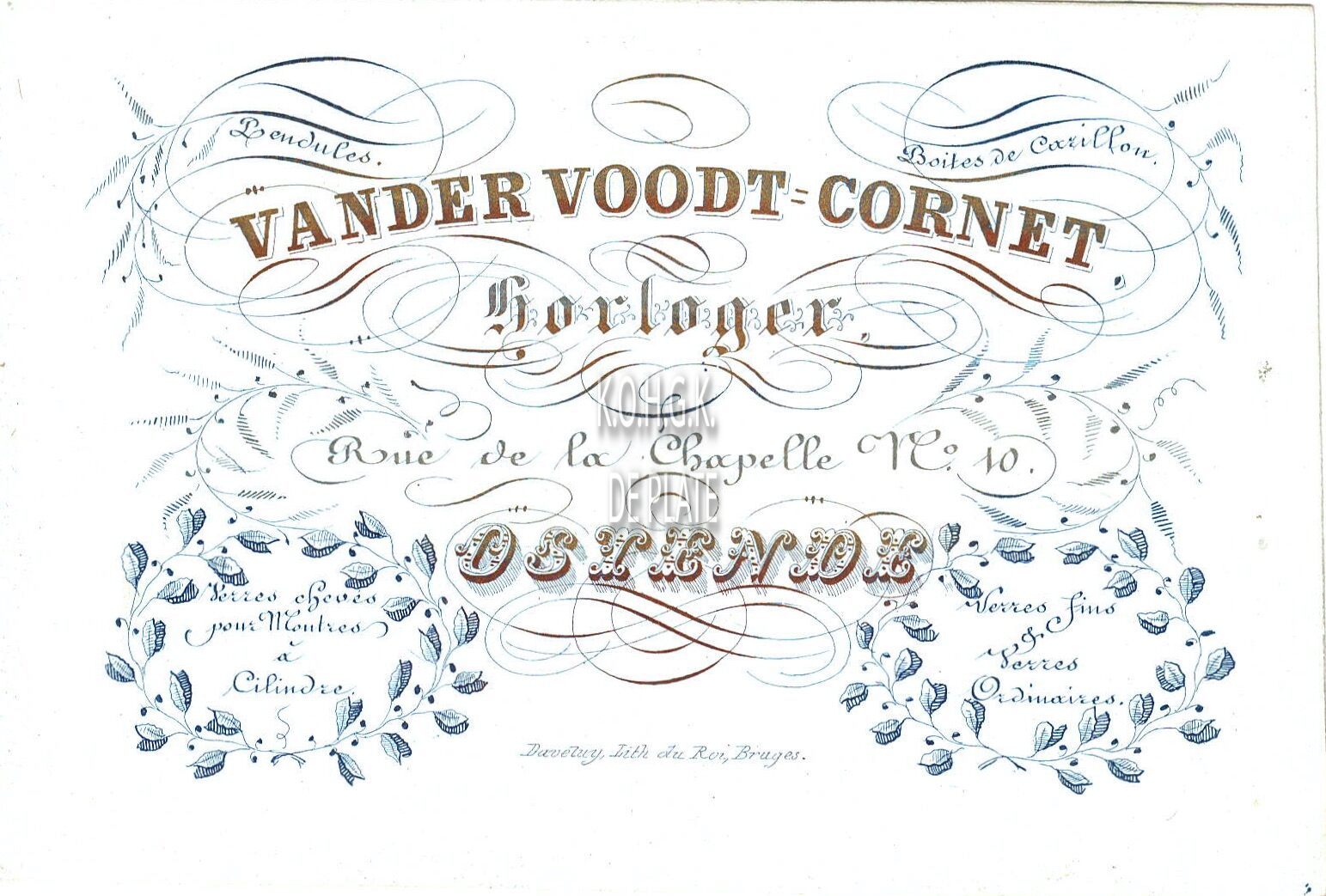 Formaat : 8,8 x 13 cm. - Vander Voodt-Cornet. Horloger. Rue de la Chapelle N° 10, Ostende. Pendules, Boites de Carillon. Verres chevés pour Montres à cilindre. Verres Fins & Verres Ordinaires.