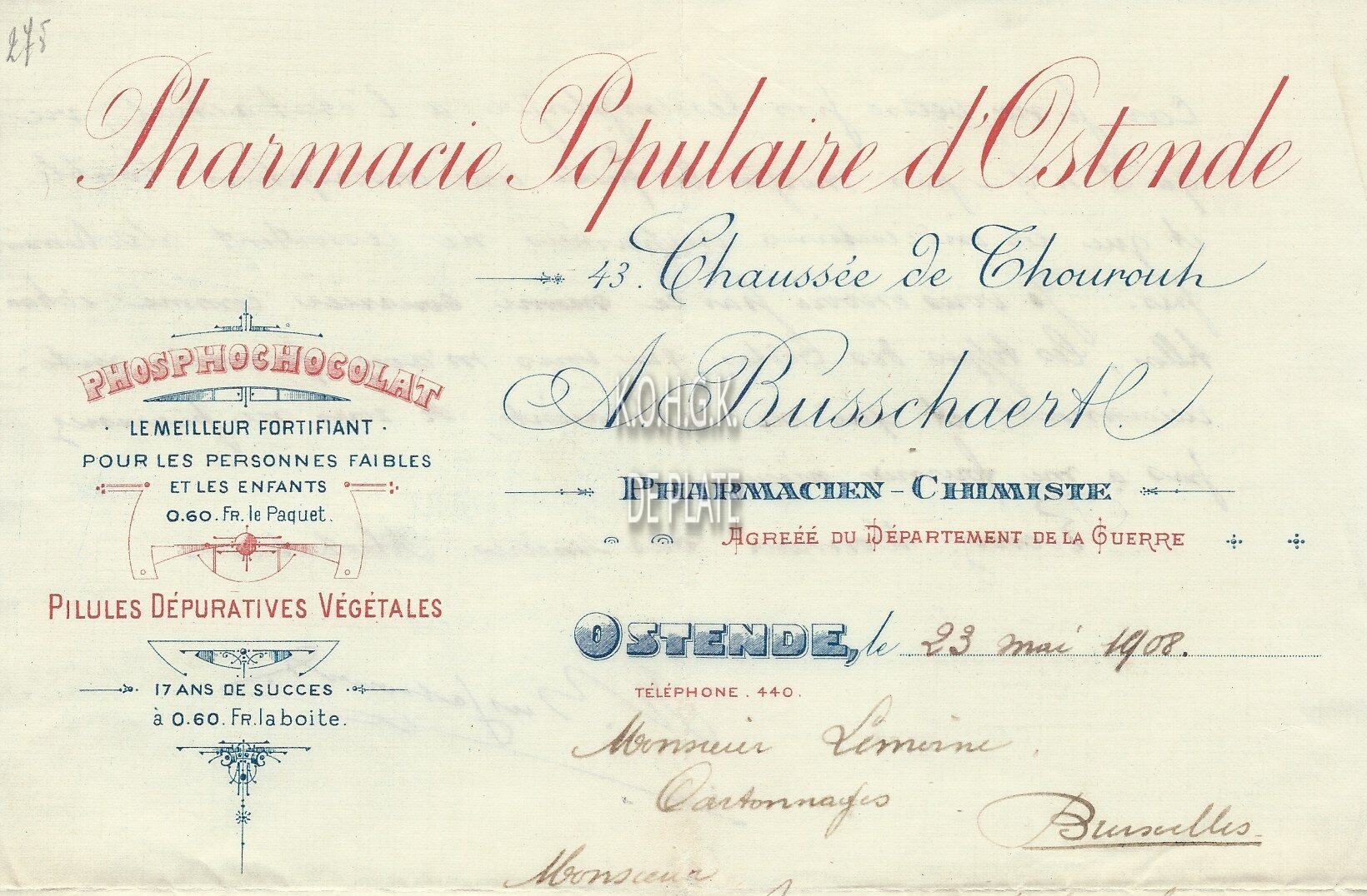 "De apotheek was gelegen derde huis van de Muscarstraat. Het had een brede gevel met inrijpoort en een etalage met ingang. Met het tweede huis van dezelfde hoek was de schoenwinkel Degrijse" (Etienne Blommaert)