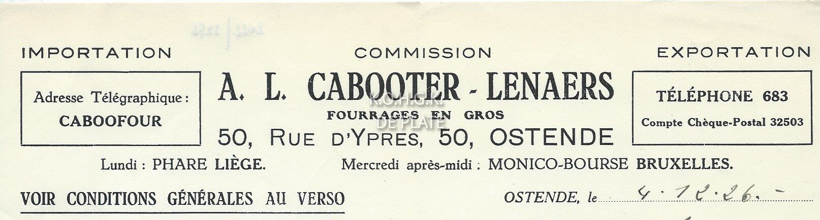 Omschrijving Invoer - Uitvoer Trefwoorden HANDEL ; HANDELSCORRESPONDENTIE A.L. CABOOTER-LENAERS (GROOTHANDEL IN VOEDERGEWASSEN) IEPERSTRAAT Plaatskenmerk ARCHIEF 110 ARCHIEFDOOS HANDEL Inventarisnummers 2022/2256 04/ 12/ 1926 Herkomst AANKOOP Print