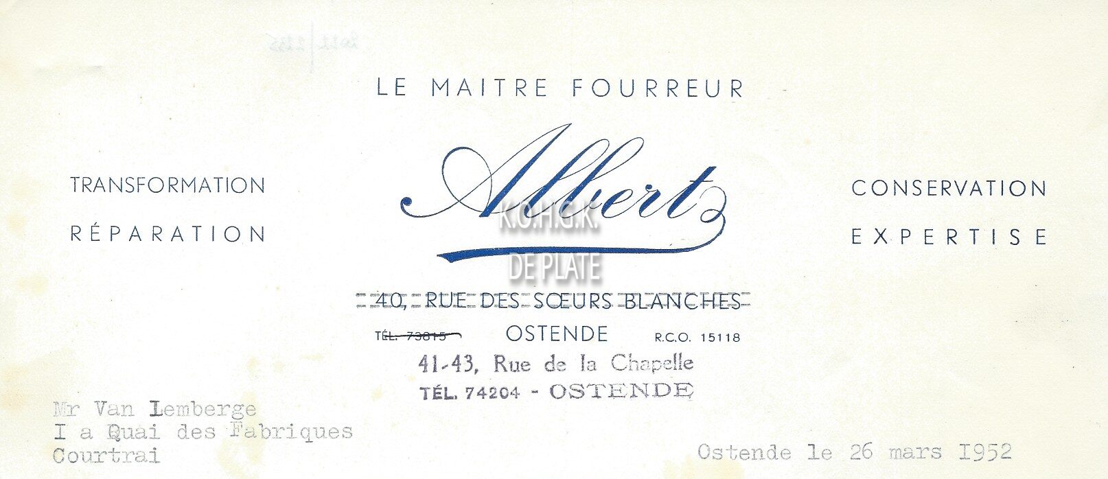 Omschrijving Transformation - Réparation - Conservation - Expertise Trefwoorden HANDEL ; HANDELSCORRESPONDENTIE ALBERT (BONTWERKER) HANDEL ; KLEDING KAPELLESTRAAT Plaatskenmerk ARCHIEF 110 ARCHIEFDOOS HANDEL Inventarisnummers 2022/2235 26/ 03/ 1952 Herkomst AANKOOP Print