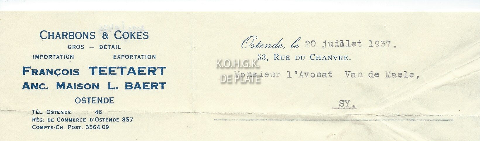 Handelscorrespondentie : François Teetaert. Kolenhandel. Hennepstraat 53, Oostende