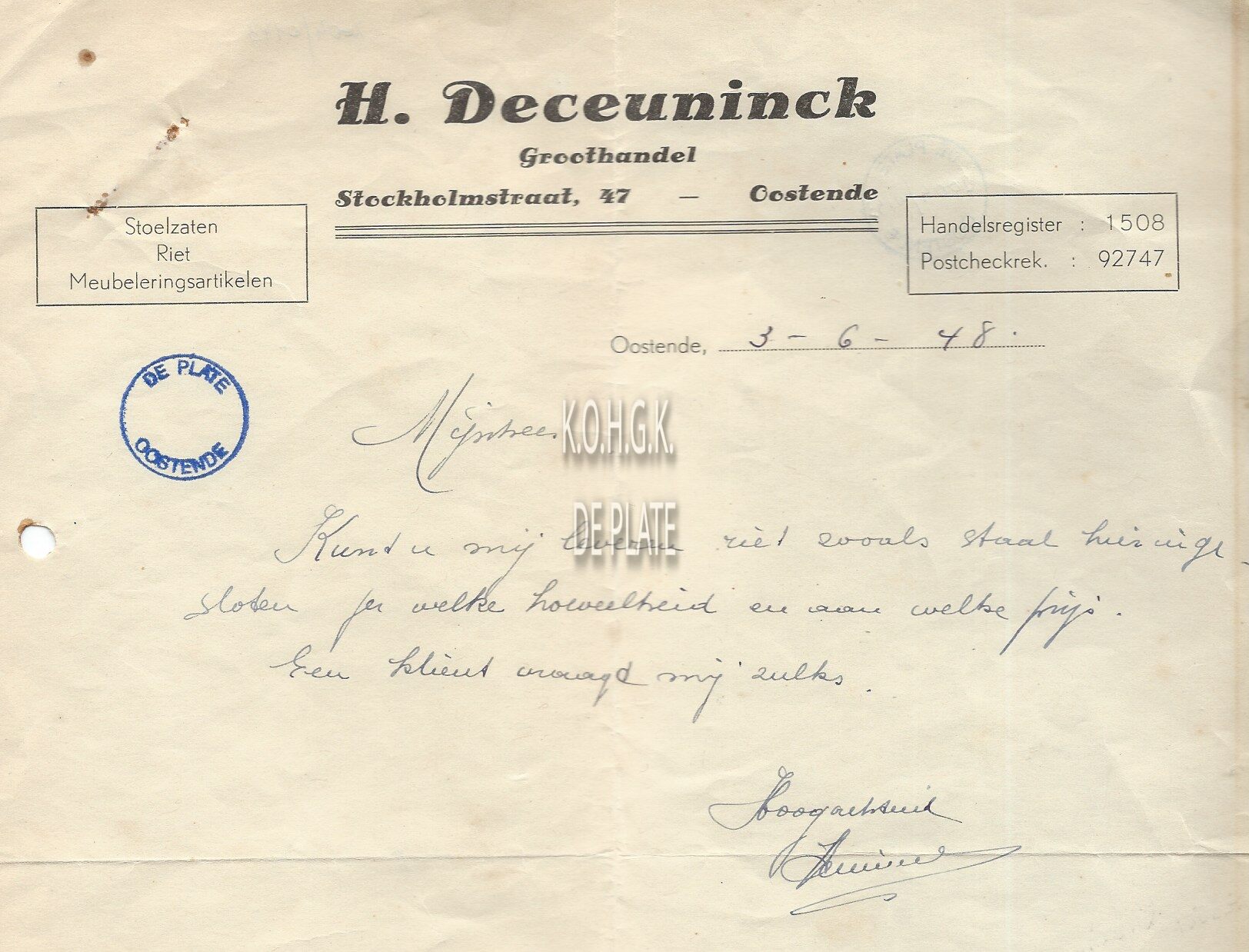 Trefwoorden HANDEL ; HANDELSCORRESPONDENTIE DECEUNINCK H. (MEUBELHANDEL) STOCKHOLMSTRAAT Plaatskenmerk ARCHIEF 110 ARCHIEFDOOS HANDEL Inventarisnummers 2004/0143 03/ 06/ 1948 Print