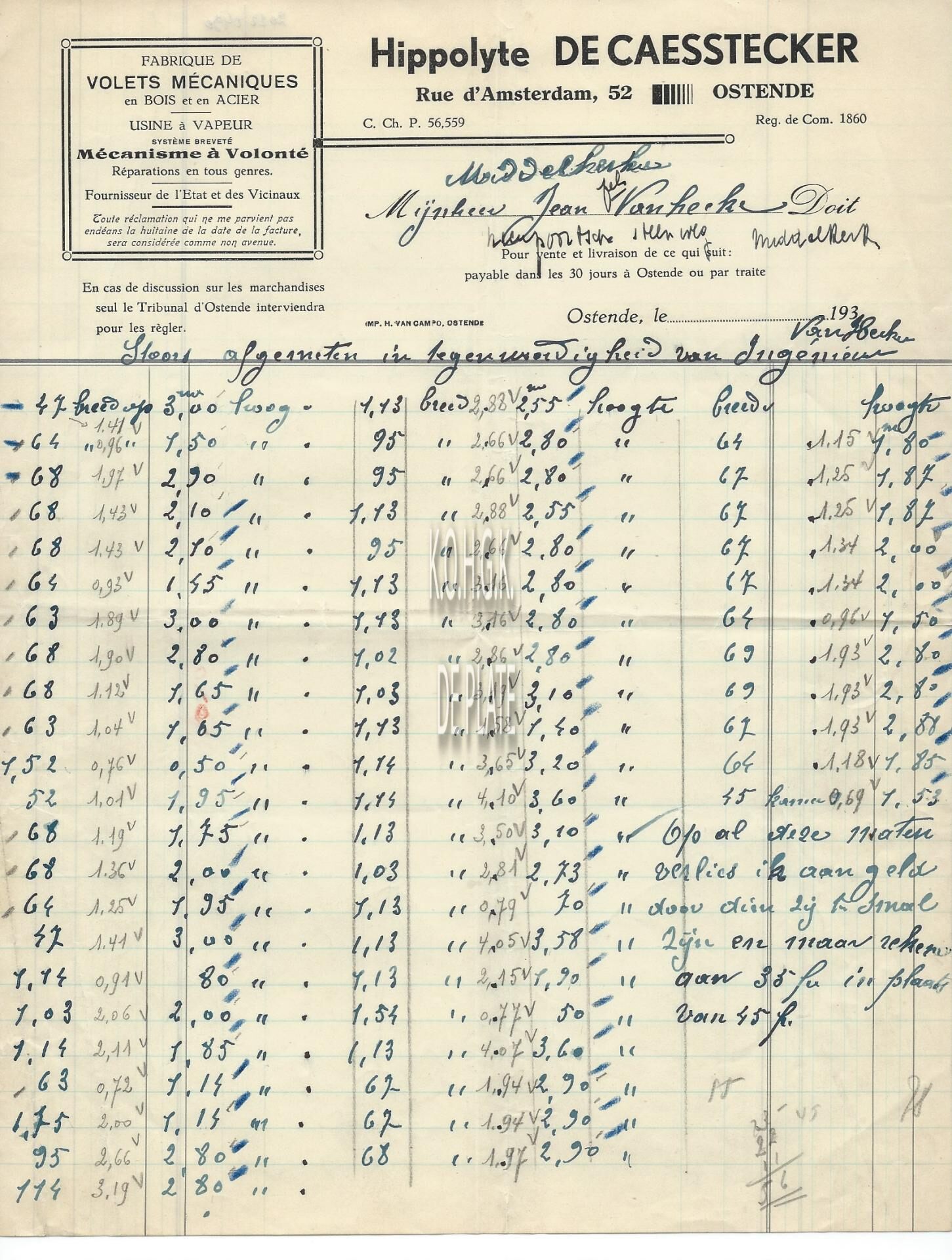 Omschrijving en bois et en acier. Usine à vapeur. Système breveté. Mécanisme à Volonté. Réparations en tous genres. Fournisseur de l'Etat et des Vicinaux. Trefwoorden HANDEL ; HANDELSCORRESPONDENTIE HIPPOLYTE DE CAESTECKER (ROLLUIKEN) AMSTERDAMSTRAAT Plaatskenmerk ARCHIEF 110 ARCHIEFDOOS HANDEL Inventarisnummers 2022/0490 Herkomst AANKOOP Vervaardiger Imp. H. van Campo Print