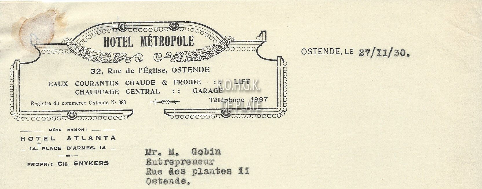 Handelscorrespondentie : Hotel Métropole. Kerkstraat 32, Oostende