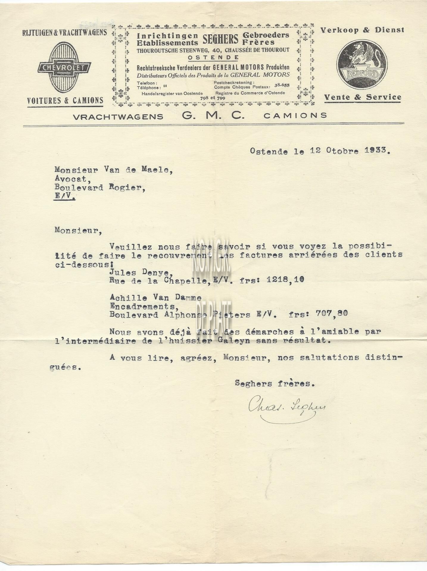 Handelscorrespondentie : Inrichtingen Gebroeders Seghers. Garage. Torhoutsesteenweg 40, Oostende
