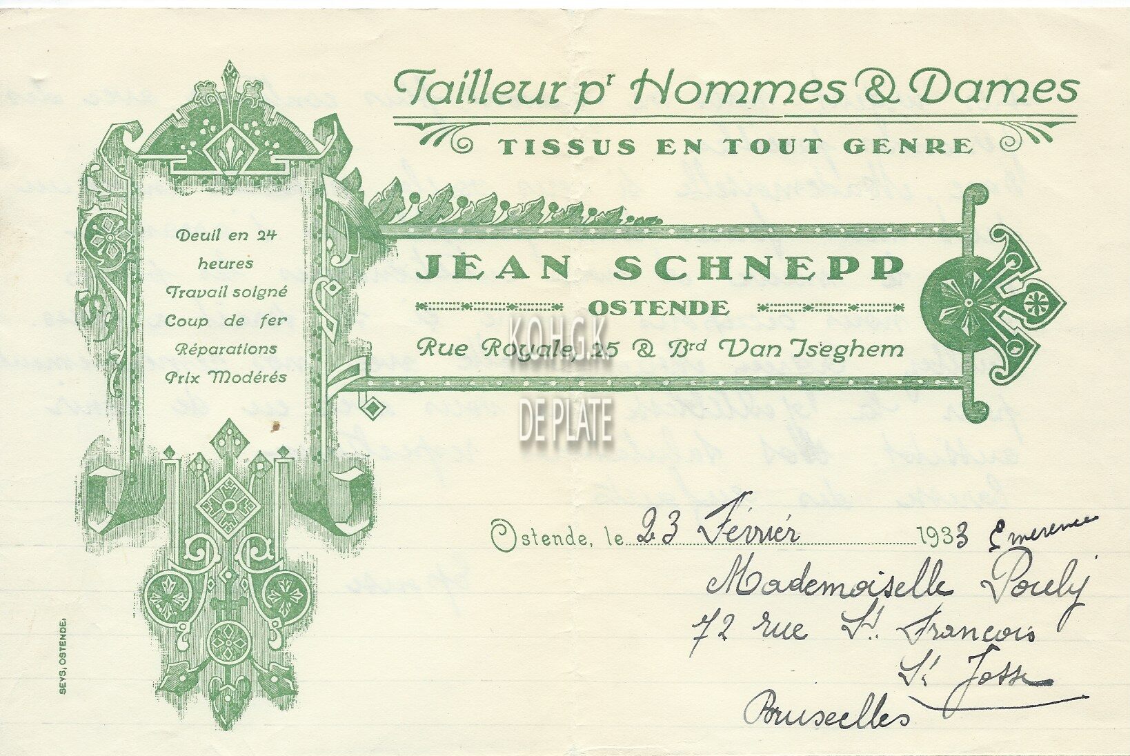 Handelscorrespondentie : Jean Schnepp. Kleermaker. Koningsstraat 25 en Van Iseghemlaan, Oostende
