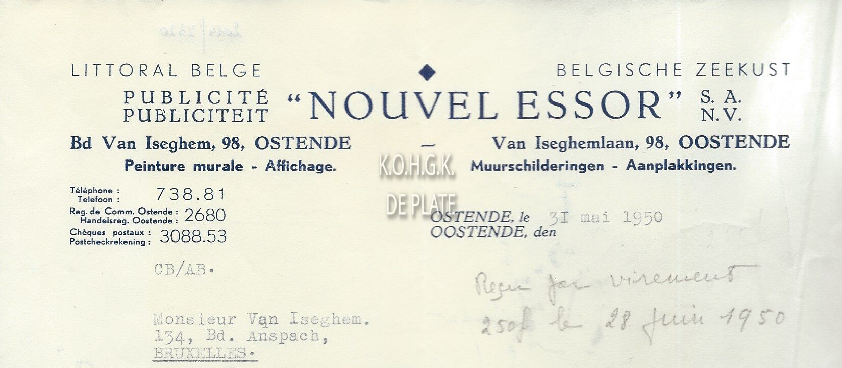 Handelscorrespondentie : Nouvel Essor. Publiciteit. Van Iseghemlaan 98, Oostende