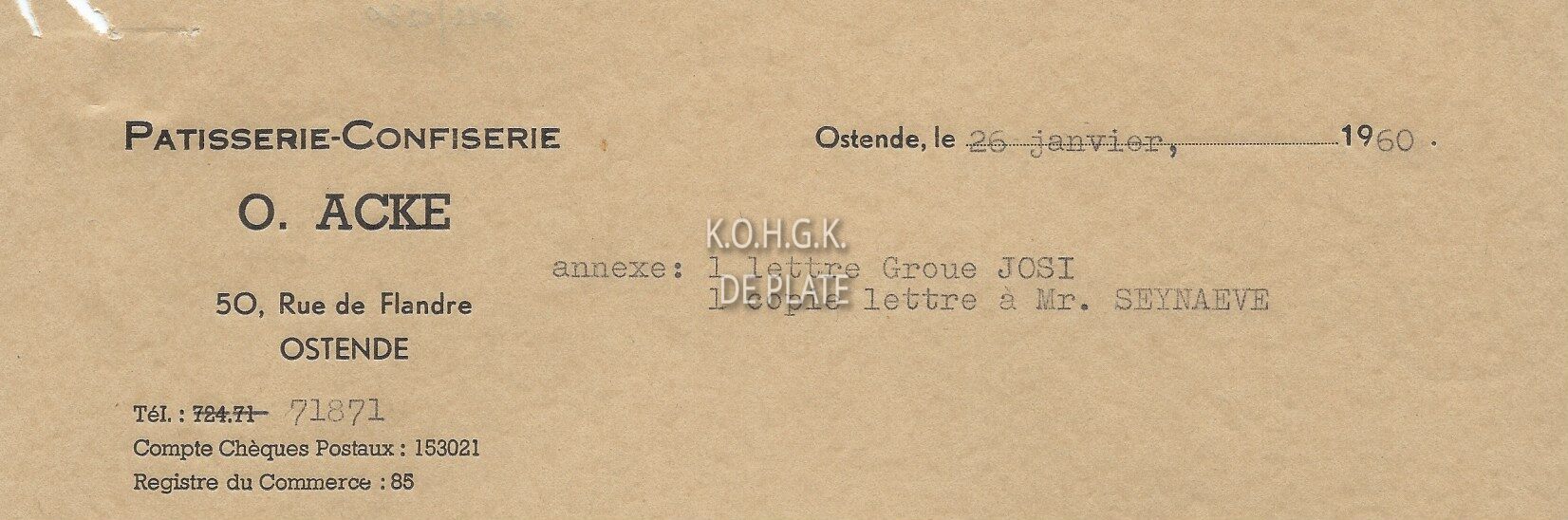 Trefwoorden HANDEL ; HANDELSCORRESPONDENTIE O. ACKE (PATISSERIE TEAROOM IJSSALON) VLAANDERENSTRAAT Plaatskenmerk ARCHIEF 110 ARCHIEFDOOS HANDEL Inventarisnummers 2022/2230 26/ 01/ 1960 Herkomst AANKOOP Print