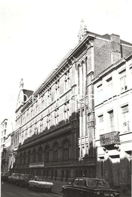Formaat : 12 x 8 cm. - De kostschool in de Rogierlaan 10-12. - Schoolgebouw opgetrokken in 1900-1901 naar ontwerp van Joseph Caluwaers (atheneum) en Achille Raoux (kostschool); hiervoor worden enkele huizen en de Sint-…
