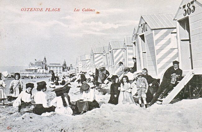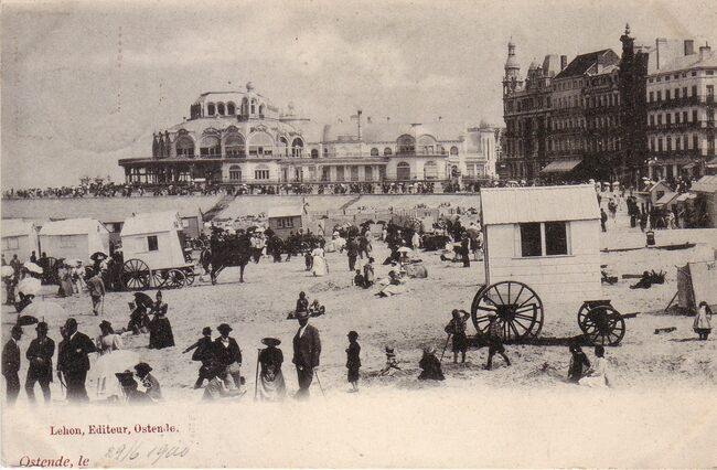 Th. Van den Heuvel. - Ostende Plage - Les Cabines. - Strandrecreatie op het Groot Strand nabij de badkarren. Op de achtergrond, de westgevel van het derde Kursaal.