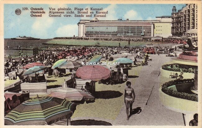 Postkaart Albert , N° 109. - Oostende - Vue générale. Plage et Kursaal. Oostende - Algemeen zicht. Strand en Kursaal. Ostend - General view. Sands and Kursaal. - De "Lido" op het Groot Strand. Op de achtergrond…