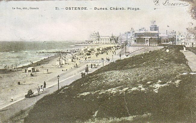 Le Bon, édit., Ostende, N° 20. - Ostende - Dunes. Châlet. Plage. - Vooraan, de duinen en het Koninklijk Chalet. De Koninklijke Gaandrijen zijn nog niet gebouwd