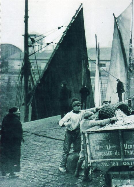 Formaat : 9 x 12,5 cm. - Het lossen van vis. De man links is Jules Helsmoortel (vermeld op foto)