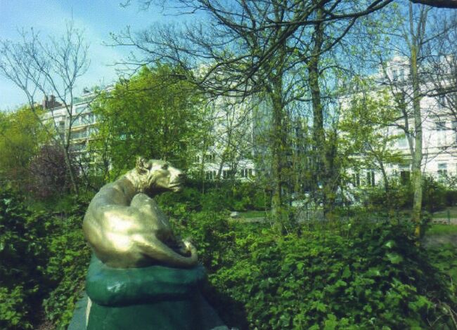 Formaat : 14 x 9.5 cm. - Het borstbeeld van James Ensor, een replica in brons van beeldhouwer Irenée Duriez. Het staat nabij de hoek van de Leopold II-laan (rechts) en de Karels Janssenslaan