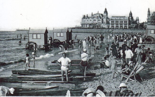 Foto (kopie), formaat : 15x 9 cm. - Strandrecreatie op het Groot Strand. Op de achtergrond, het derde Kursaal langs de Zeedijk.