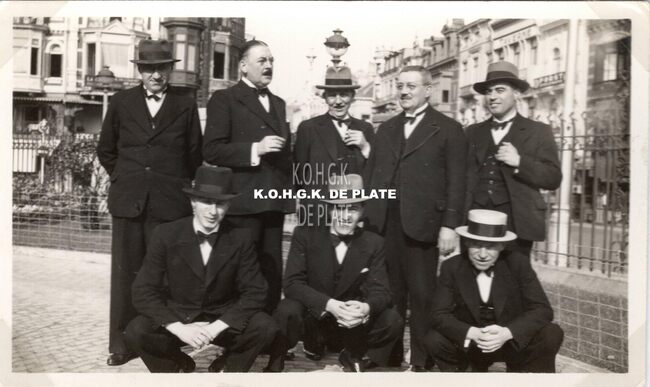 Formaat : 6 x 10;5 cm. - Croupiers in feestkledij in de voortuin van het kursaal met in de achtergrond de Van Iseghemlaan.