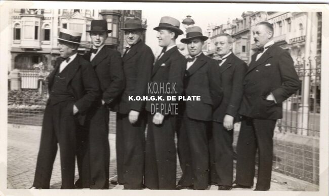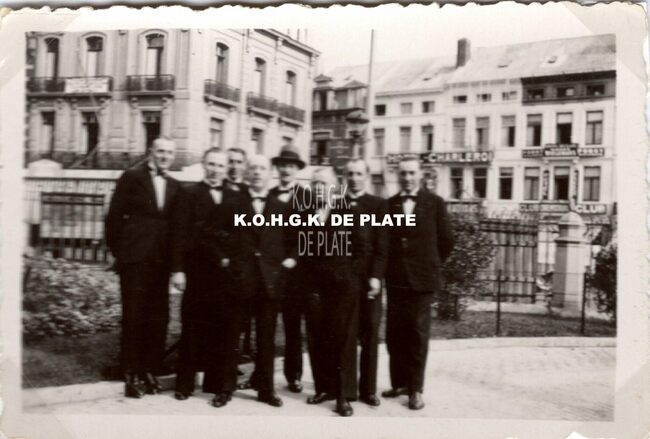 Formaat : 6 x 10,5 cm. - Groep croupiers in feestkledij in de tuin van het kursaal. In de achtergrond de Van Iseghemlaan