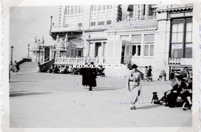 Formaat : 5,5 x 8,5 cm. Wandelend en zittend genieten van de zon aan de westgevel van het Kursaal