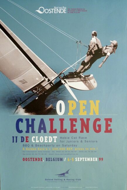Formaat : 60 x 40 cm. Hobie Cat Race for Juniors & Seniors. BBQ & Beachparty on Saturday. 6 Golden Euro's + 100.000 BEF. prizes to win!