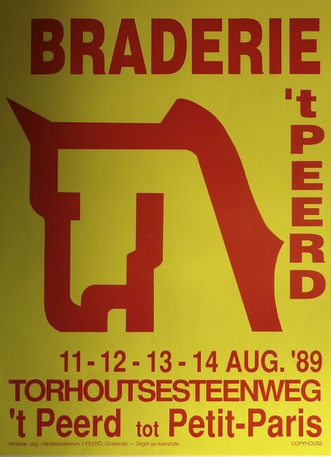 Affiche : Braderie 't Peerd. Torhoutsesteenweg 't Peerd tot Petit-Paris. 11 tot 14 augustus 1989.
