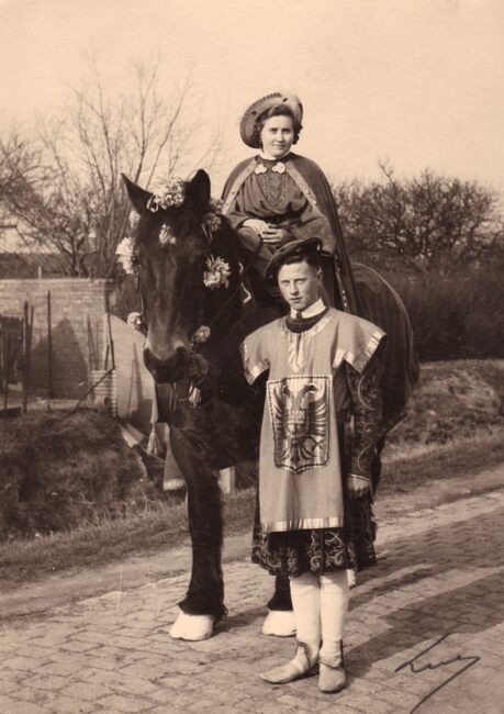 De Rode Valken (?), met vlag in de 1-meistoet op de Vindictivelaan ter hoogte van de Kapellestraat.