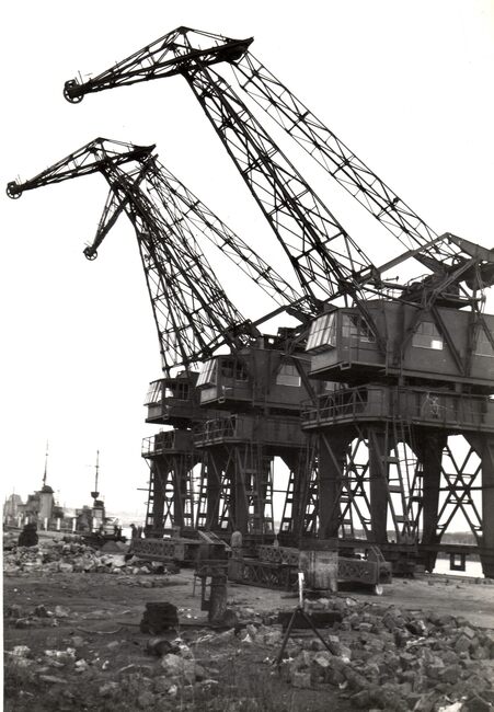 Formaat : 13 x 18 cm. - Er wordt gebaggerd in de havengeul. Op de voorgrond links haalt een hijskraan de resten van een wrak op