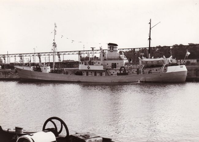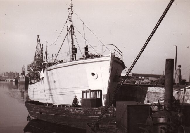 Het radiopiratenschip "Magda Maria" aangemeerd op het einde van de haven. Zie ook inventarisnummer 2014/1323