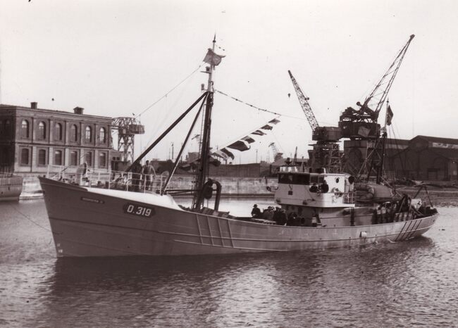 Formaat : 13 x 18 cm. - De O.319 Noordende II in het Vlotdok tijdens een proefvaart. De familie van de bemanning is mee. Het vaartuig werd in 1947 gebouwd op de scheepswerf Beliard-Crighton & C° voor de rederij…