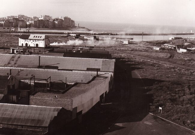 Formaat : 13 x 18 cm. - Zicht van op het dak van een gebouw aan de Hendrik Baelskaai op het Visserijdok met links de Slipwaykaai, in het middden de scheepswerf Seghers en rechts de vuurtoren (Lange Nelle).