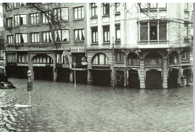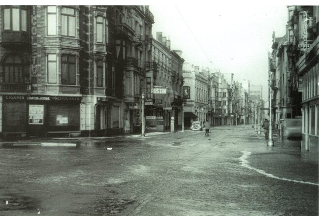 Tropic T 406. - Ostende oender woater 1953. - Hoek Kapelle- en Jozef II-straat. Op de hoek, de wijn en likeurenhandel G. Ackermans en in de Kapellestraat, herenkledij Marvan en het grootwarenhuis Samar