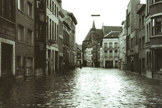 Tropic T 428. - Ostende oender woater 1953. - De Nieuwstraat richting Mijnplein. Op de hoek met de Schippersstraat, café 't Klein Ijsland - Inventaris 2020/1290 fotoarchief D2 album 3. Herkomst : Simoens