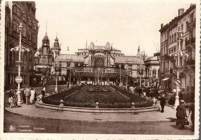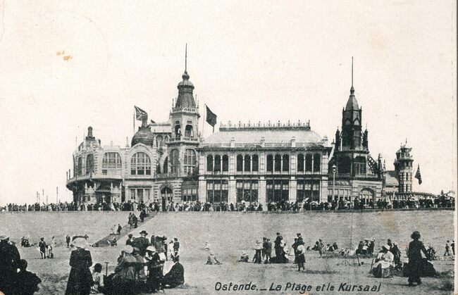 De zuidgevel van het derde Kursaal, gezien vanaf de Leopoldlaan. Op de keerzijde van de kaart, publiciteit voor : Ganterie Universelle. Maria du Verger. Ostende, 9, Rue d'Ouest.