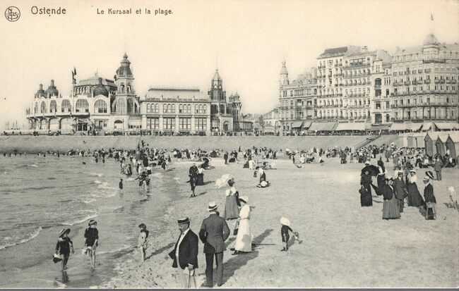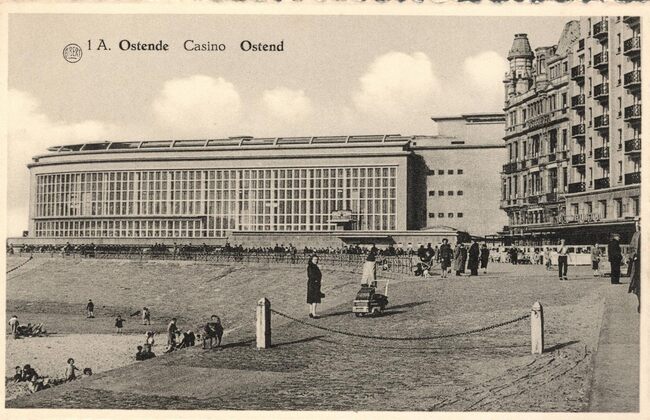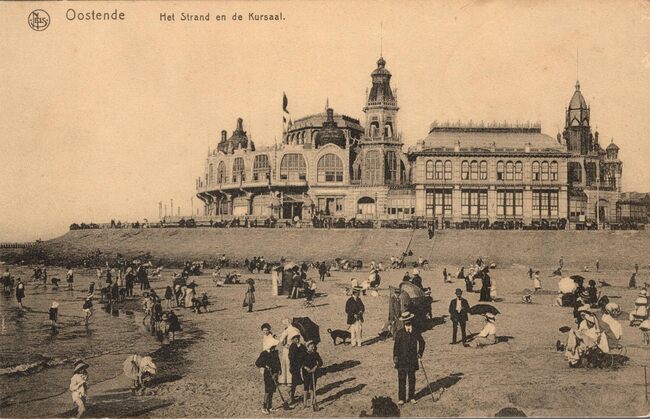 Nels. Ern. Thill, Simonisstraat, 20-22, Brussel. - De westgevel van het derde Kursaal langs de Zeedijk. Vooraan, strandrecreatie op het Groot Strand.