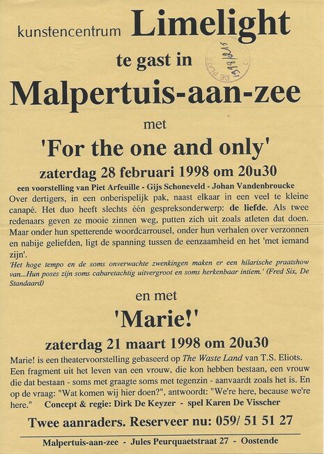 (1) een voorstelling van Piet Arfeuille, Gijs Schoneveld, Johan Vandenbroucke. (2) concept en regie : Dirk De Keyzer. Spel : Karn De Visscher