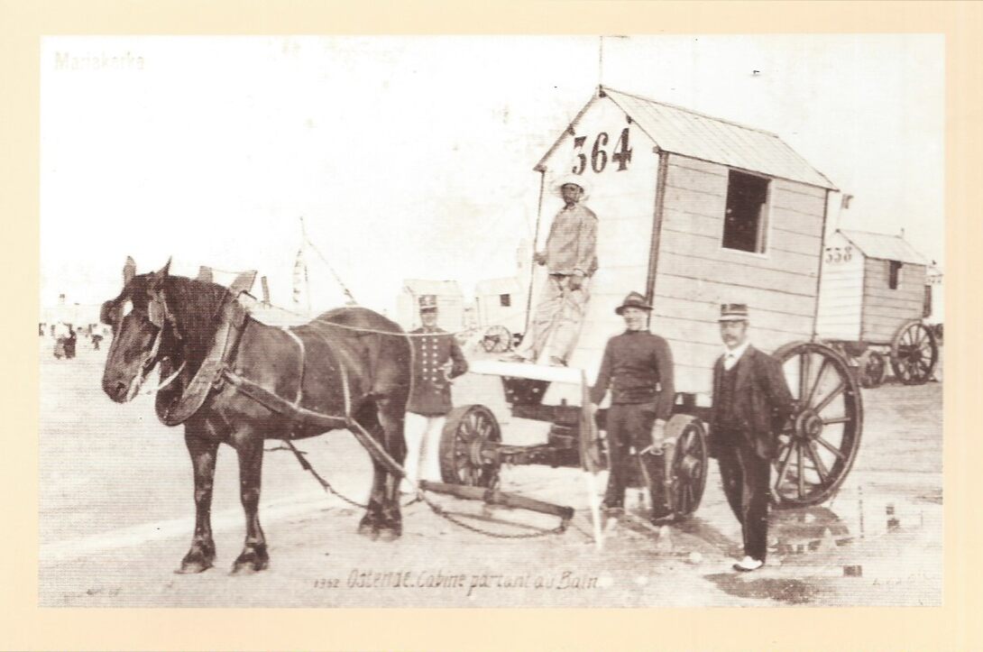 Bij de organisatie van de badendienst kwam er heel wat kijken. Er kwamen immers bijna 400 badkarren op het Oostends strand. Hierboven ziet men de redder, de voerman, een ontvanger en een inspecteur van de badendienst (Zichtje genomen op het Klein Strand) (Omer Vilain)