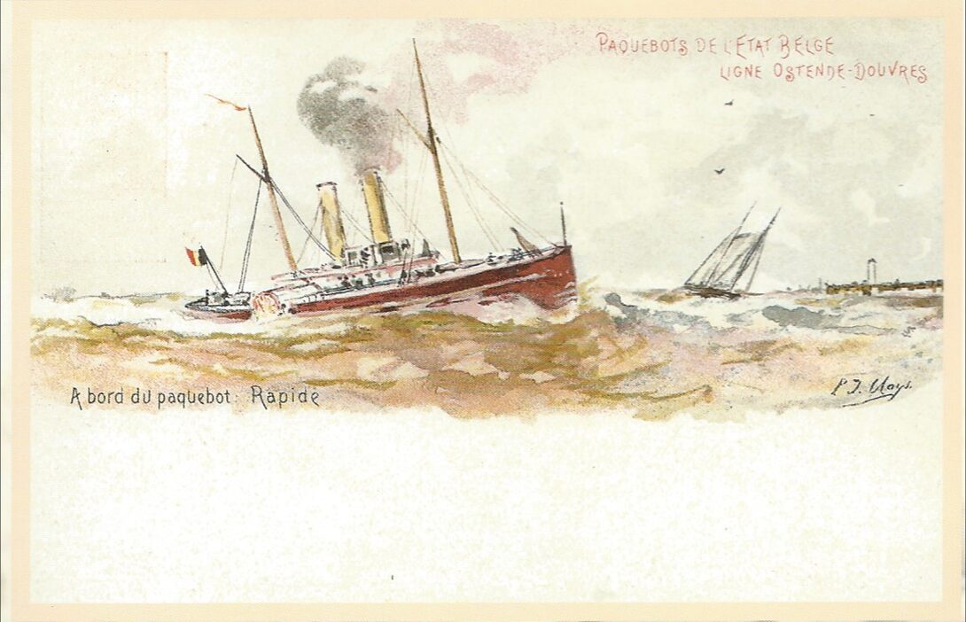 De befaamde marine-schilder P.J. Cla[y]s mocht in 1899 twee kaarten ontwerpen voor de Dienst der Posterijen (één de heenreis, de andere de terugreis voorstellend). Daar er tussen 1887 en 1897 niet minder dan 9 mailboten in dienst waren was op iedere kaart naargelang het schip een andere naam te lezen. (Omer Vilain)