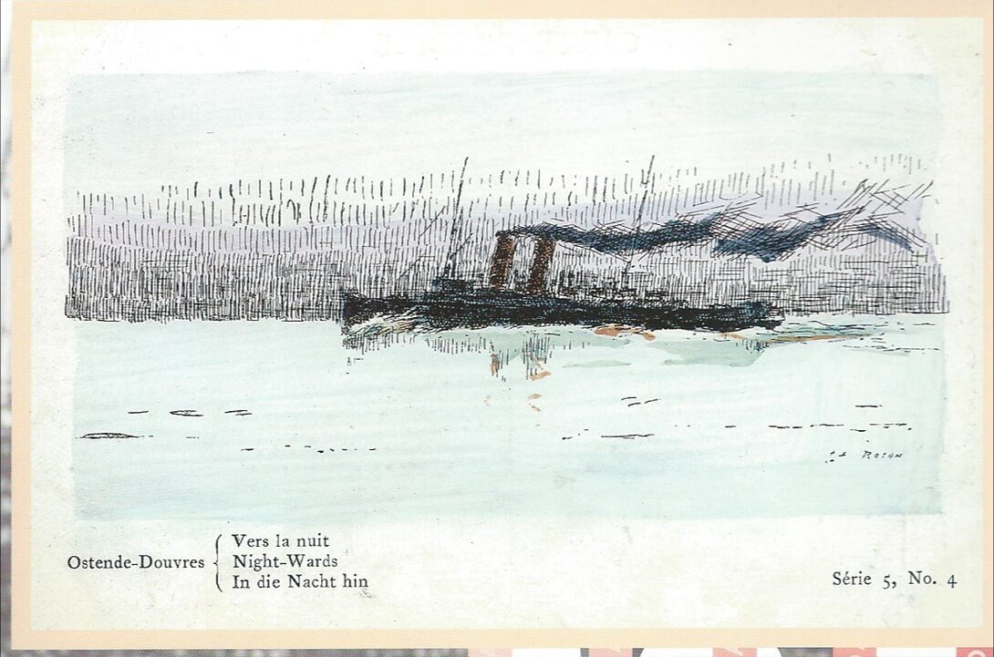 De Oostendse kunstenaar Louis Royon, die vele jaren als marine-officier op alle wereldzeeën had gevaren, mocht voor een Parijse uitgeverij een reeks van 72 kaarten ontwerpen. Tussen deze 72 pentekeningen waren er ook enkele mailboten te zien, zoals hier de Oostende-Doverlijn bij het vallen van de avond. (Omer Vilain)
