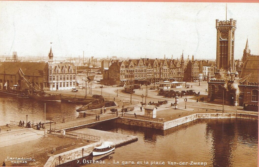 Het Stationsplein (nu Ernest Feysplein) met de trapgevelhuizen. Rechts de mooie toren van het station "Oostende-Stad", op de voorgrond de Kapellebrug en helemaal in de verte de Hazegraskerk.