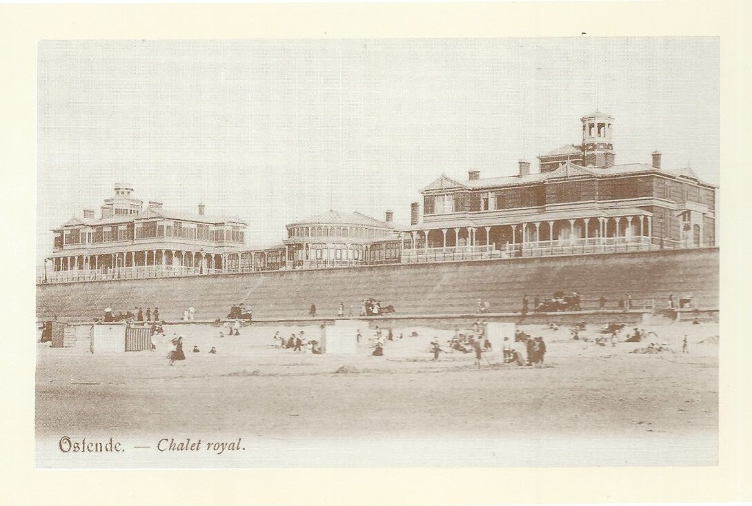 Het Koninklijk Chalet in opdracht van Koning Leopold II tussen 1874 en 1876 in de toenmalige duinen tussen de Parijsstraat en de Koninginnelaan aan de Zeedijk gebouwd. Na de Tweede Wereldoorlog wegens de bouwvallige toestand afgebroken (Omer Vilain)