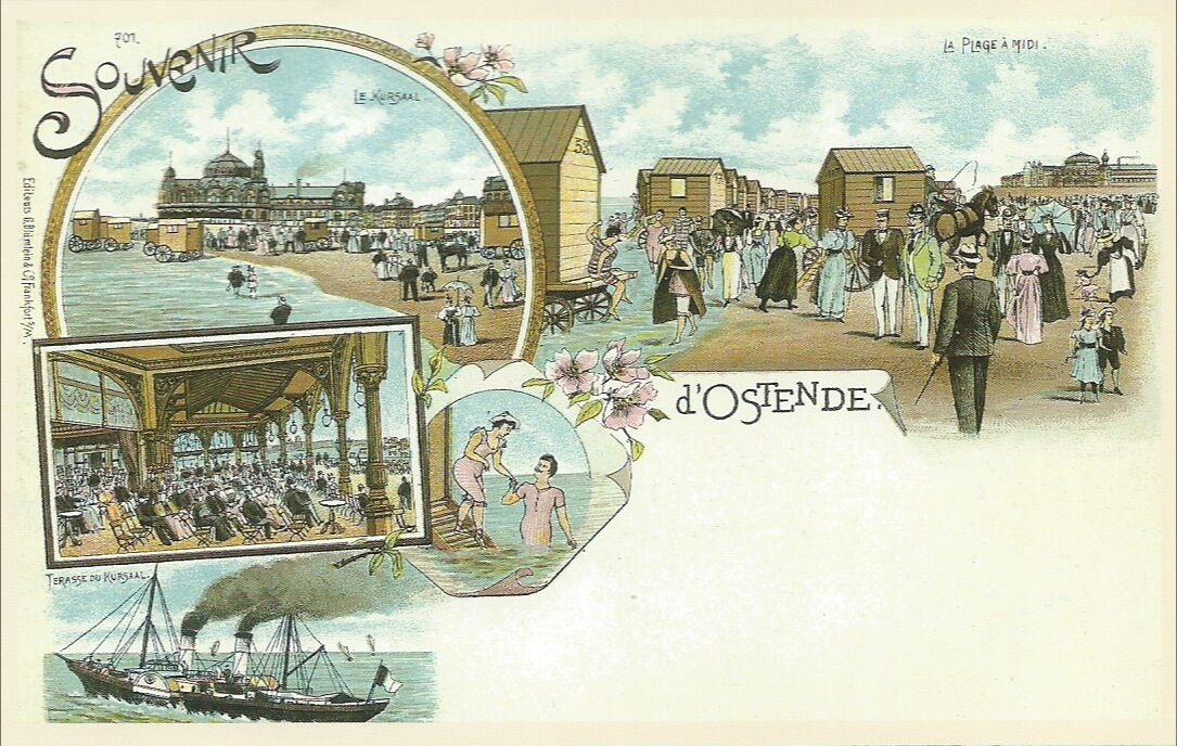 Strand en Kursaal. Baders en wandelaars op het strand. Het terras van het Kursaal. Een koppel gaat van uit een badwagen gaan baden. De Maalboot Oostende-Dover die nog met raderwielen vaart. (Omer Vilain)