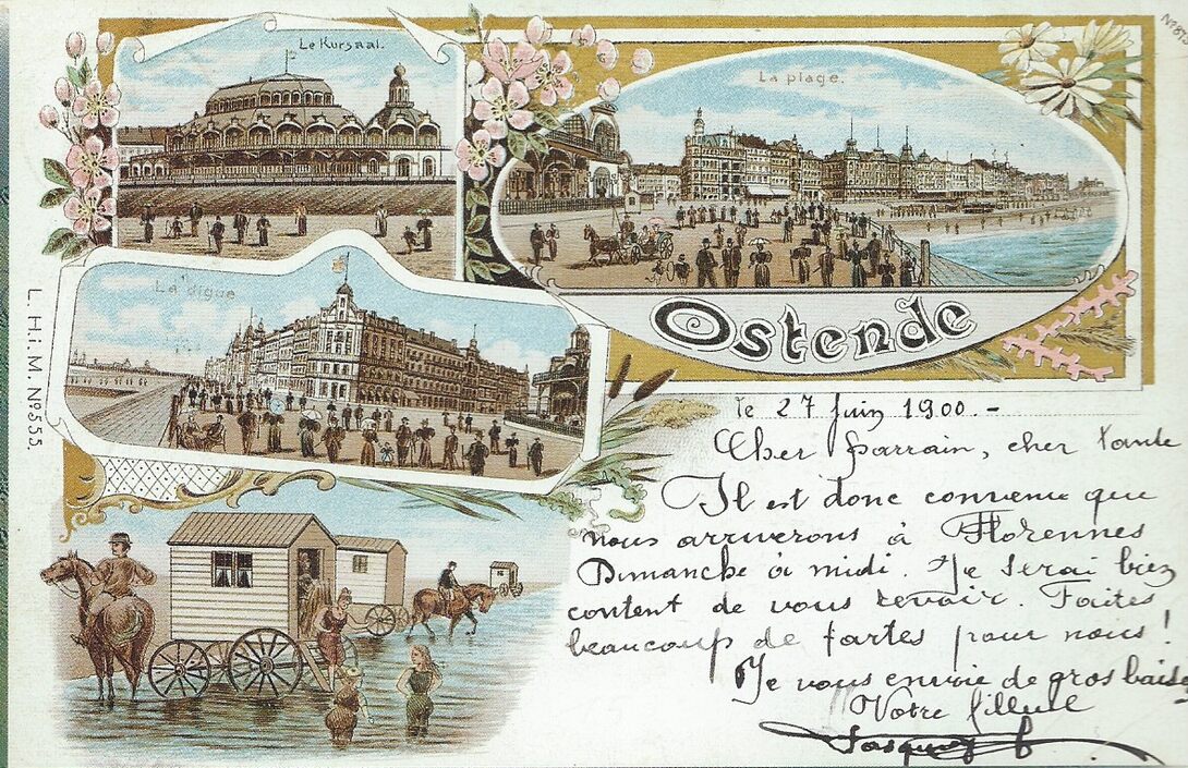 Het Kursaal. Het Westerstrand. De Zeedijk richting Klein Strand. Badkarren (1900). (Omer Vilain)