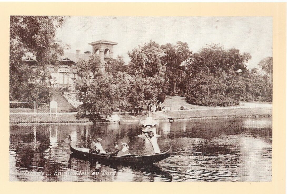 Een mooi zicht van de Trinkhall, die tijdelijk een consumtiepaviljoen was geweest. Men ziet er nog het bord "Laiterie" op staan. Het toont tevens de gondole die in het park rondvaarde. (Foto circa 1902 (Omer Vilain)