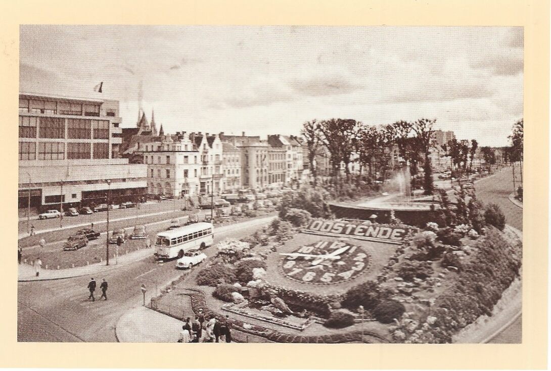 Het bloemenuurwerk reeds op een verkeerseiland gelegen. Langs weerszijden een autobaan. Een paar jaar later zou de heuvel en het bloemenhorloge verlegd worden. Dikke Mathilde mocht er plaats nemen. Op de foto ziet men de herinnering aan de jumelage "Oostende-Monaco" (Foto 1958) (Omer Vilain)