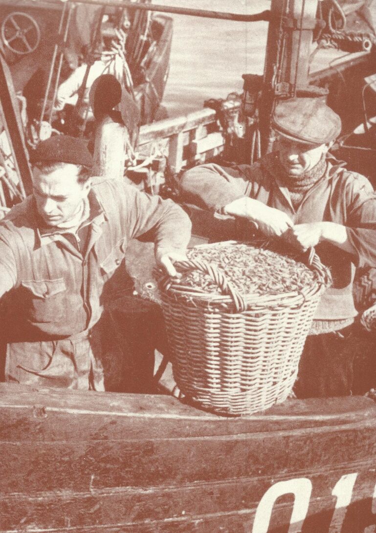 Eduard Demeulemeester, (bijnaam "Smoetgat") (rechts), eigenaar van de O.190 "Louis", lost met collega een "bénne" garnalen.