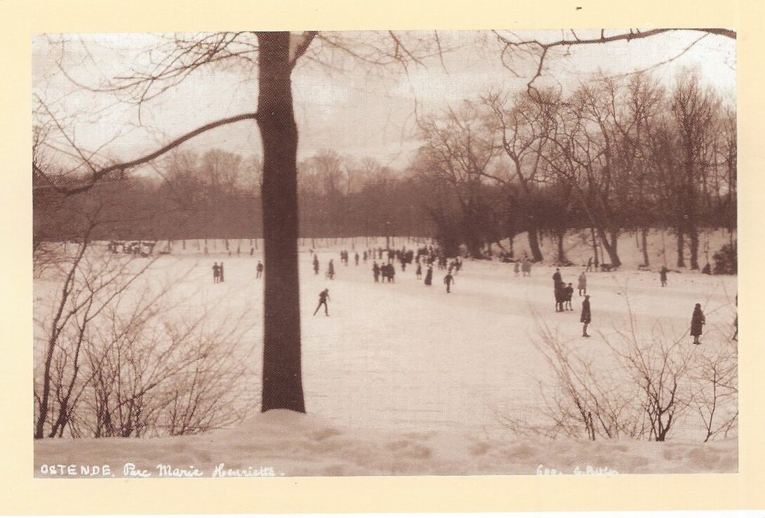 In de winter als het bij zeldzaamheid erg vriest kan er in 't Bosje geschaatst worden. Hier ijspret op de grote vijver tussen de Wereldoorlogen. Soms werden er ook wedstrijden voor amateur-schaatsers georganiseerd. (Omer Vilain)