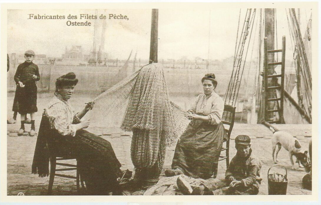 Als bijverdienste breiden de vissersvrouwen de korren voor de visvangst. (circa 1906) (Omer Vilain).