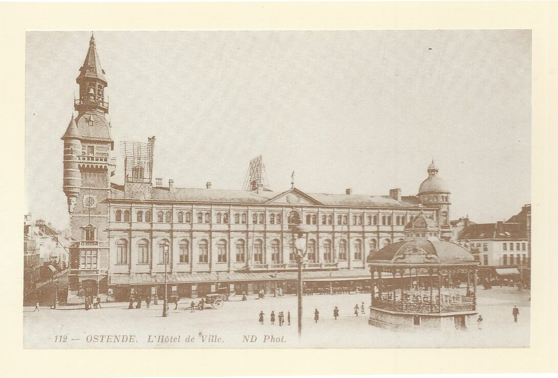 Het Stadhuis van Oostende op het Wapenplein gebouwd in 1711 (architect Jan Vrijeels). Er gebeurden verbouwingen in 1895. Uit dat jaar dateerde de mooie bakstenen toren. Vernield door brandbommen in mei 1940 (Omer Vilain)