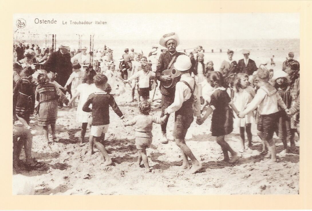 Het seizoen aan de kust heeft steeds kleine beroepen aangetrokken zoals dagbladventers, leurders met chocolade-ijs, gelegenheidsfotografen of zoals hier een straatzanger op het strand. De Italiaanse troubadour was vooral bekend op onze kust tussen 1920 en 1935 (Omer Vilain)