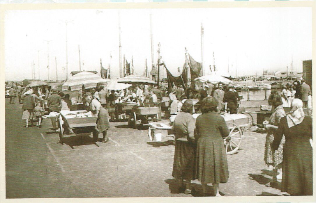 De laatste oude viskarretjes nabij "De Trap". Het waren met dezelfde karretjes dat de visvrouwen 's namiddags naar de verdere wijken van Oostende trokken om met hun vis en garnaal te leuren. (circa 1955) (Omer Vilain)