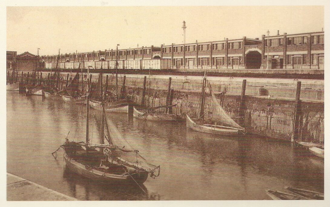 De vismijn die aan de overzijde van de haven geopend werd in 1934 en daardoor het grootste deel van de Oostendse vissersbevolking naar de Vuurtorenwijk (OPEX) deed verhuizen. In het dok ziet men maar enkele kustvissersvaartuigen. Het grote visserijdok ligt aan de achterzijde van de vismijn. (Omer Vilain)
